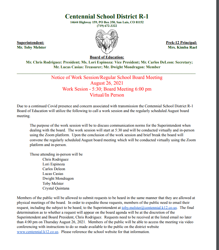 Good evening Centennial Rams! Please click the link below to join the Work Session and Regular School Board Meeting via zoom:
